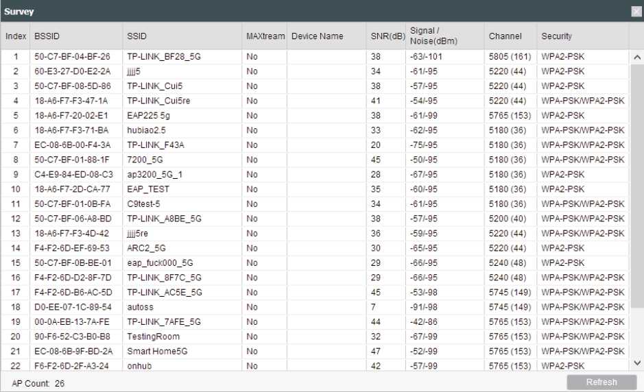 | Signal/Noise (dBm) | Displays the signal and noise value (Unit: dBm) of other APs surveyed by this device. |