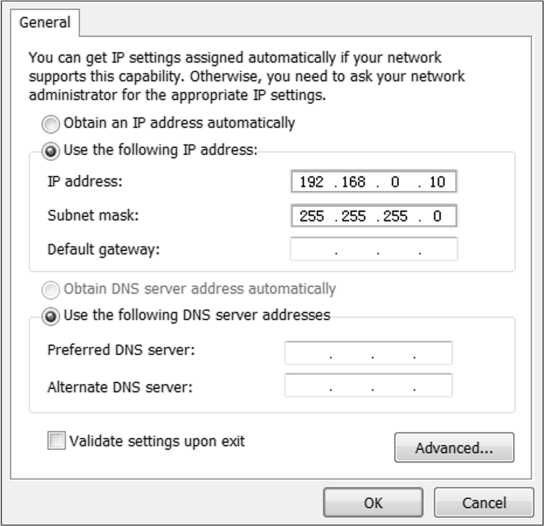 - Set the IP address of your PC as static IP address on 192.168.0.X subnet (X ranges from 2 to 253, e.g.192.168.0.10).