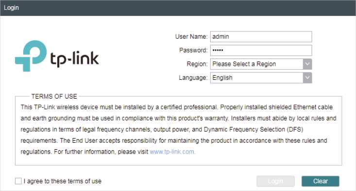 - Use admin for both of User Name and Password. Specify the region where you use the device. Available channels and maximum Transmit Power will be determined by the selected region according to the local laws and regulations. Select the appropriate language from the Language drop-down list. Read and agree the terms of use, then click Login.
