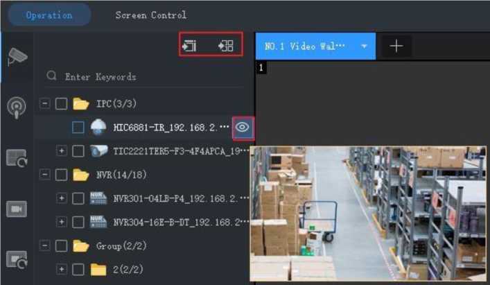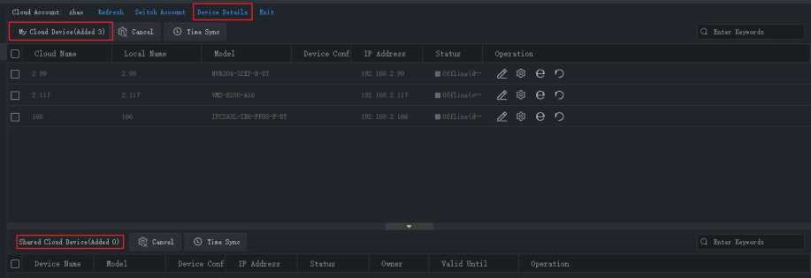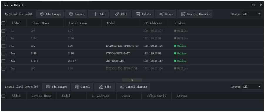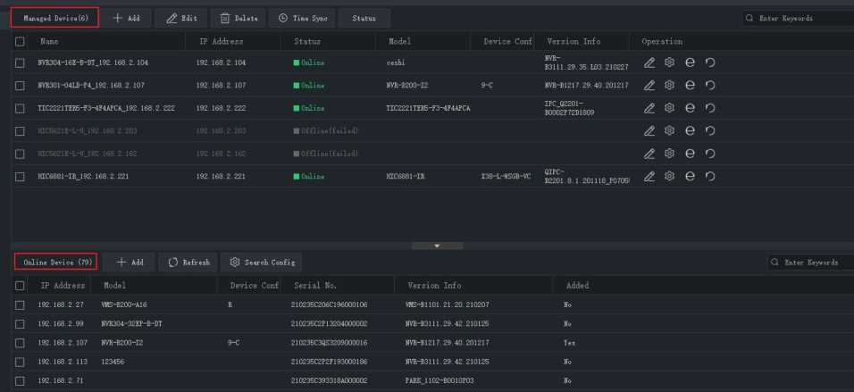 - Online Device list: The software searches online devices and refreshes automatically. Note: The discovered devices are not added yet, and you need to add them manually (see step 2).