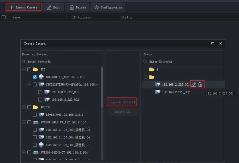 ^3: Edit device name, IP address, username/password. If the device status is Offline(incorrect username or password), click this button and change the password to the actual password. You may also double-click to edit a device. ^¡D: Configure image, encoding and OSD settings of a device (see Configure an Encoding Device).
