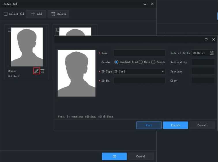 Put your mouse pointer on the face snapshot and click ^^3. You need to enter the required information including name and ID number and specify the target library. ↑