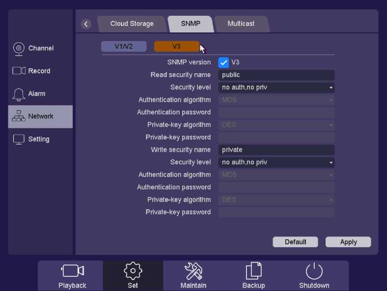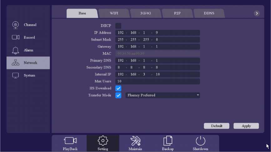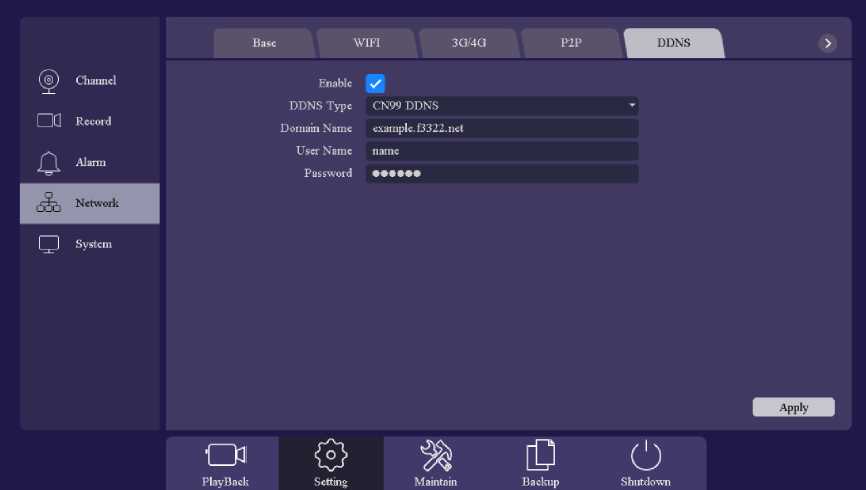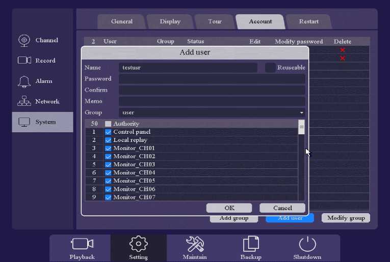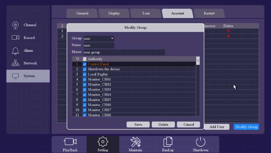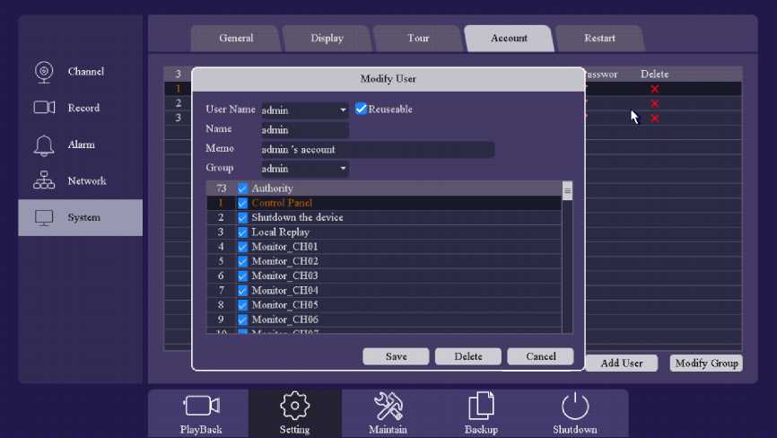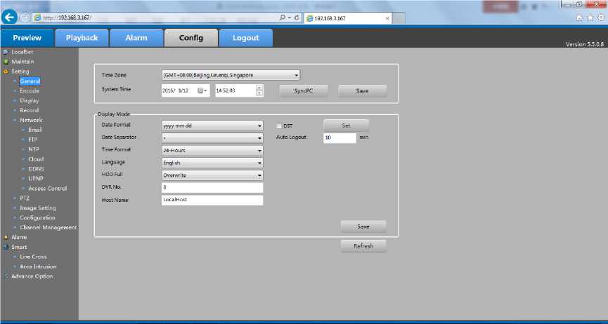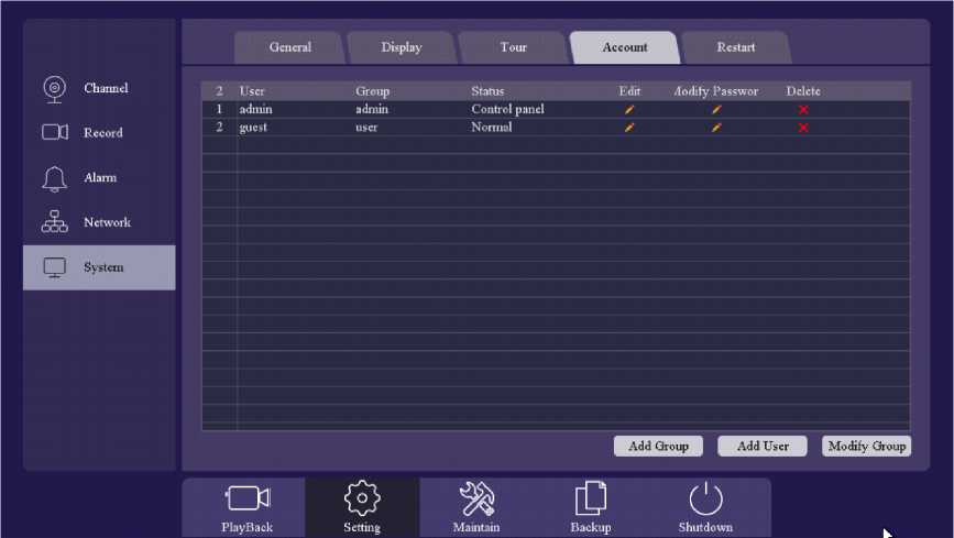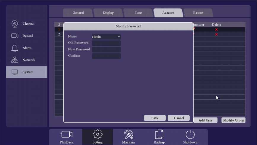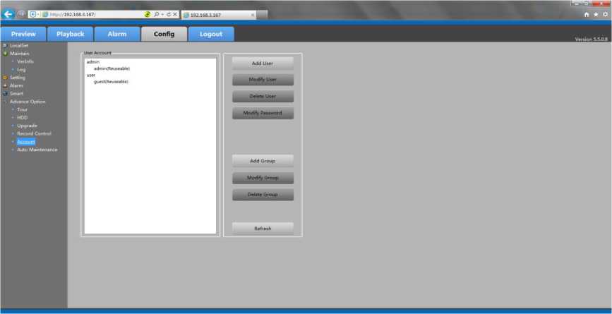 Click the Config->Advance Option->Account. It is similar to the HD DVR local settings.