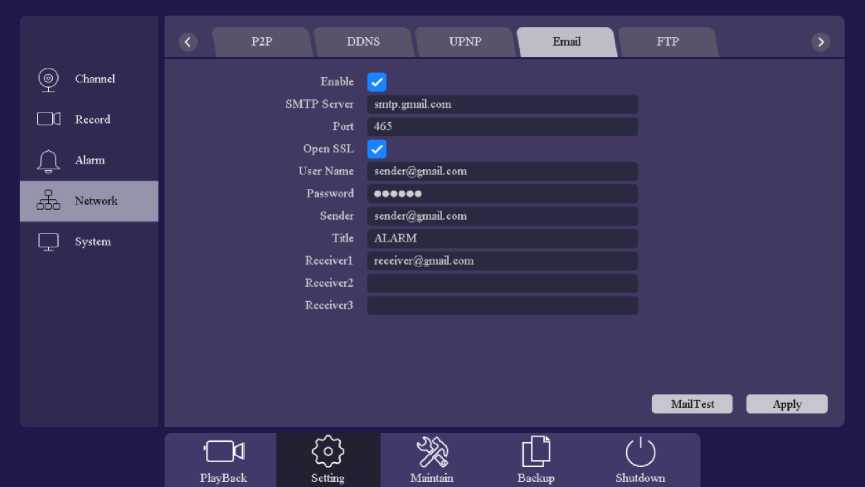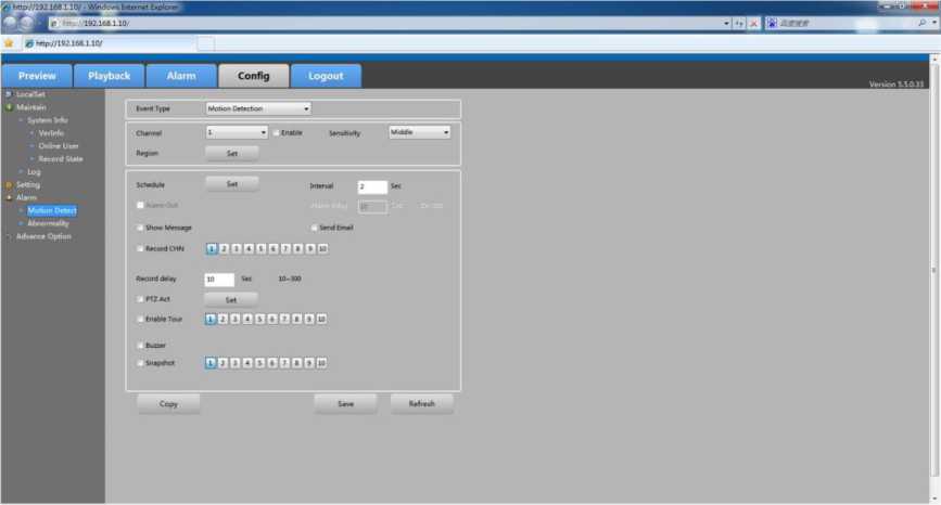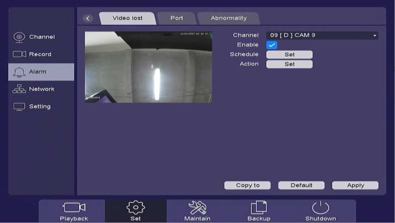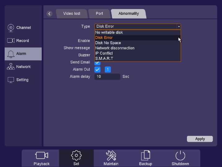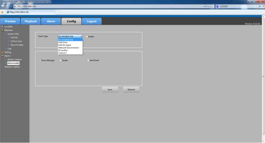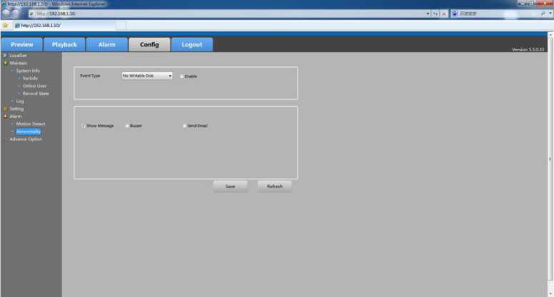 Click the Config->Alarm->Abnormality. It is similar to the local abnormality of the HD DVR. You can set the alarm recording, screen tips, buzzer alarm, sending Emails, alarm output.