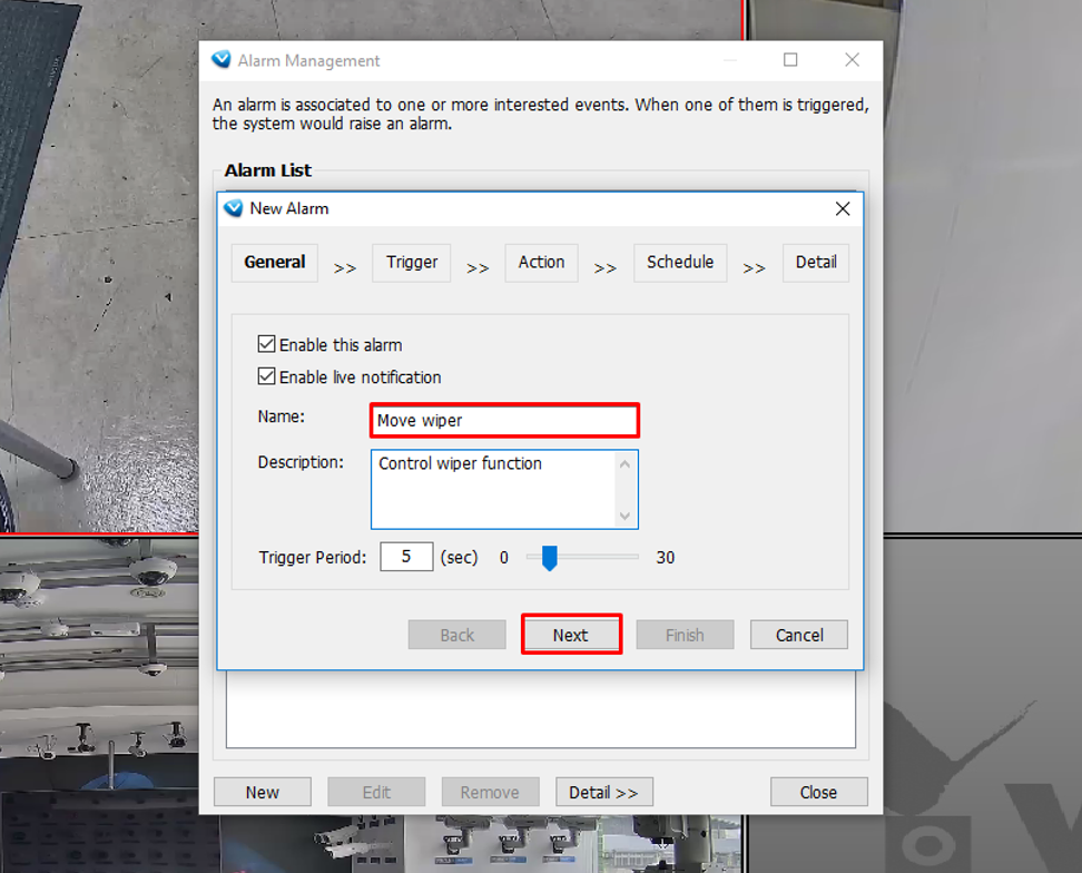 Step 5. Name your alarm (in this example we used “Move wiper”, but you can name the alarm as you like) and click Next.