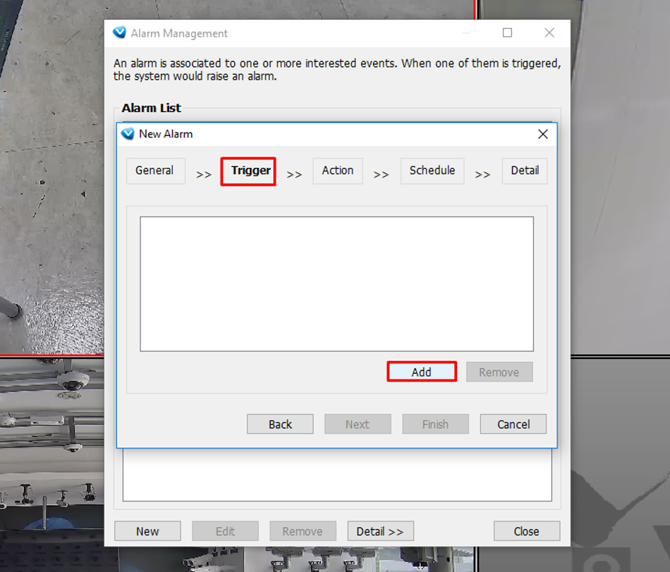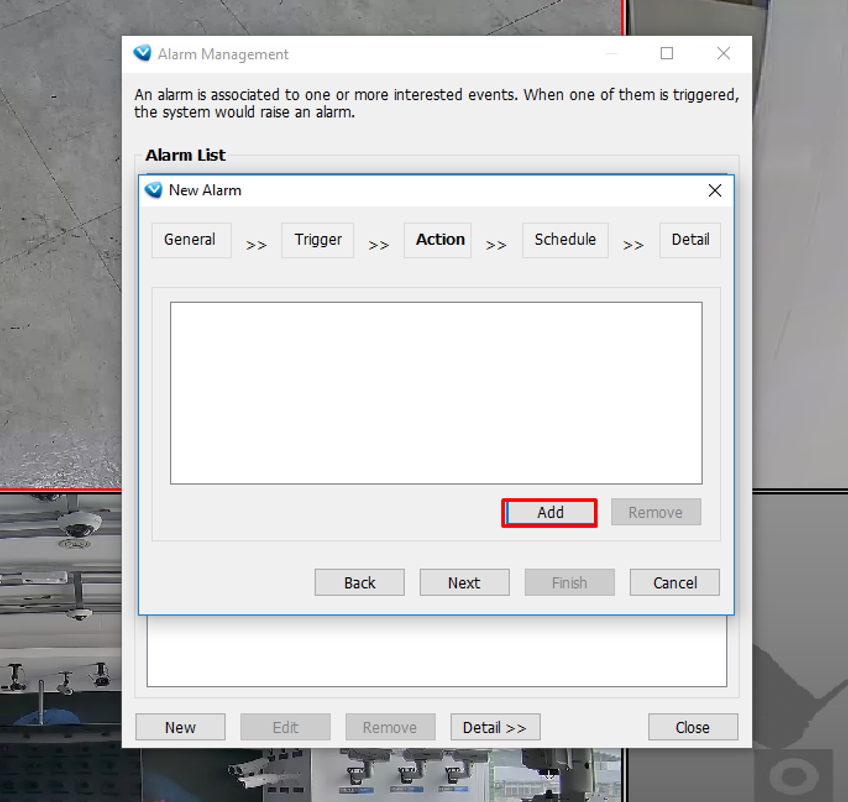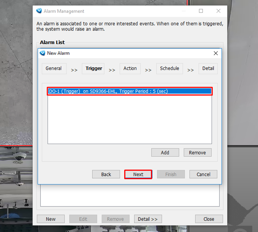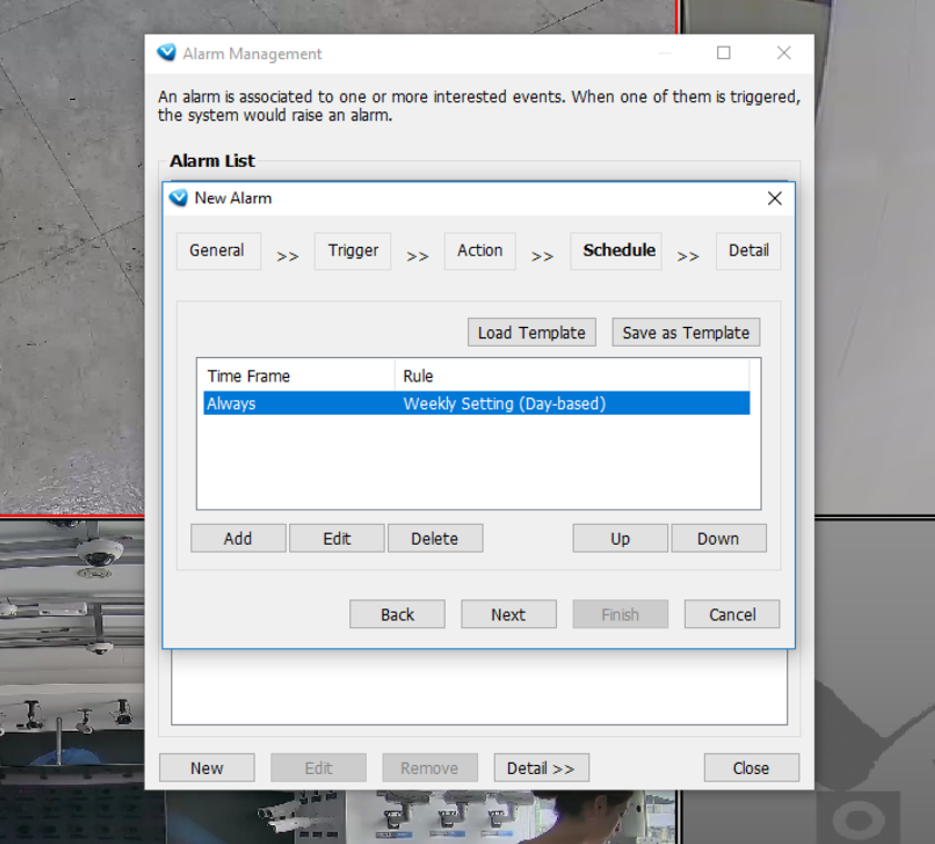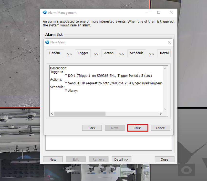 Step 13. In the “Detail” section, be sure that everything has been correctly saved and then click on the “Finish” button to save the alarm.