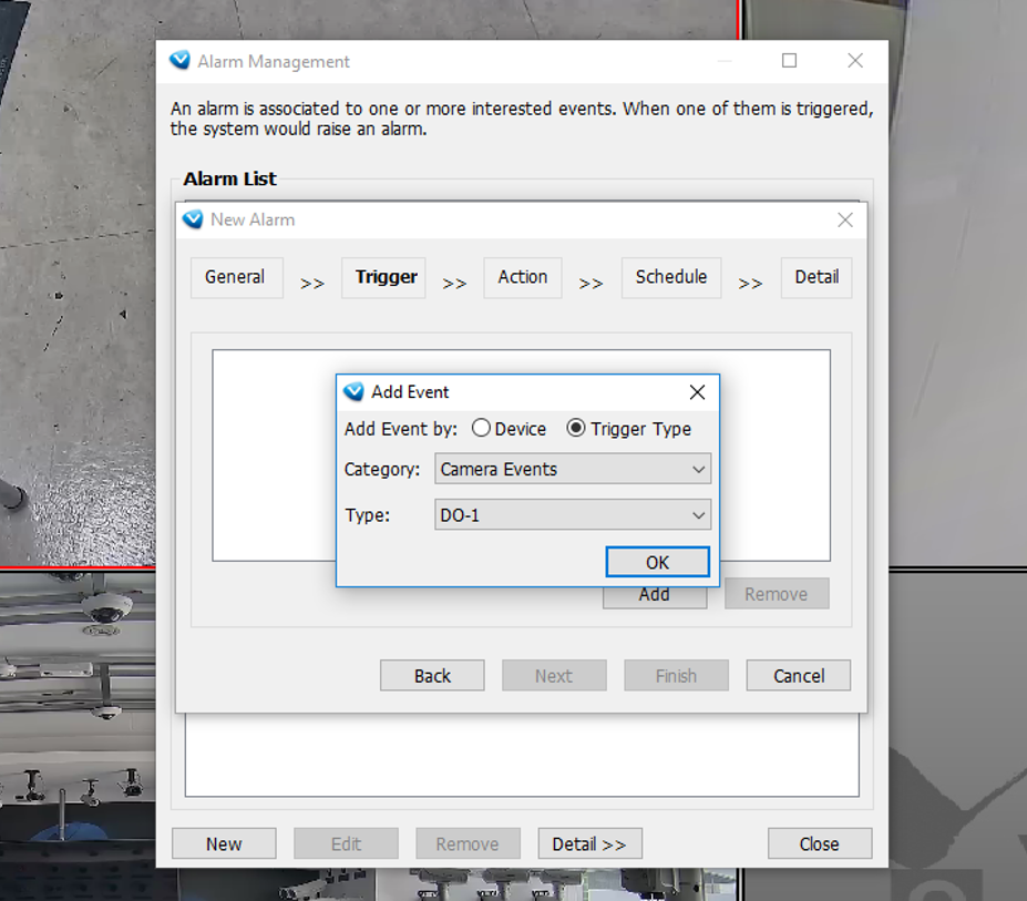 Then, choose the event as “Trigger type” (this will let the software know that is a trigger action), the category as “Camera events” (this will check the camera status) and be sure to select the “DO-1” as the type and click “OK”.