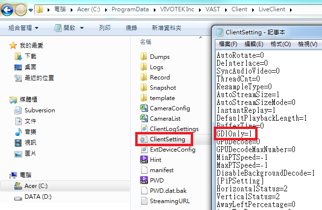 Step 2. Go to the following folder: C:\ProgramData\VIVOTEK Inc\VAST\Client\LiveClient and using any editing tool (e.g Notepad++) open the following file: ClientSetting.ini. Once open, change the GDIOnly value to “1”