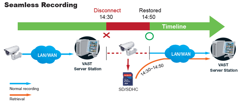 Seamless recording refers to a continuous, uninterrupted process of capturing and storing video footage. Meaning that the camera and the VAST will work together to ensure there are no gaps in the recording timeline.