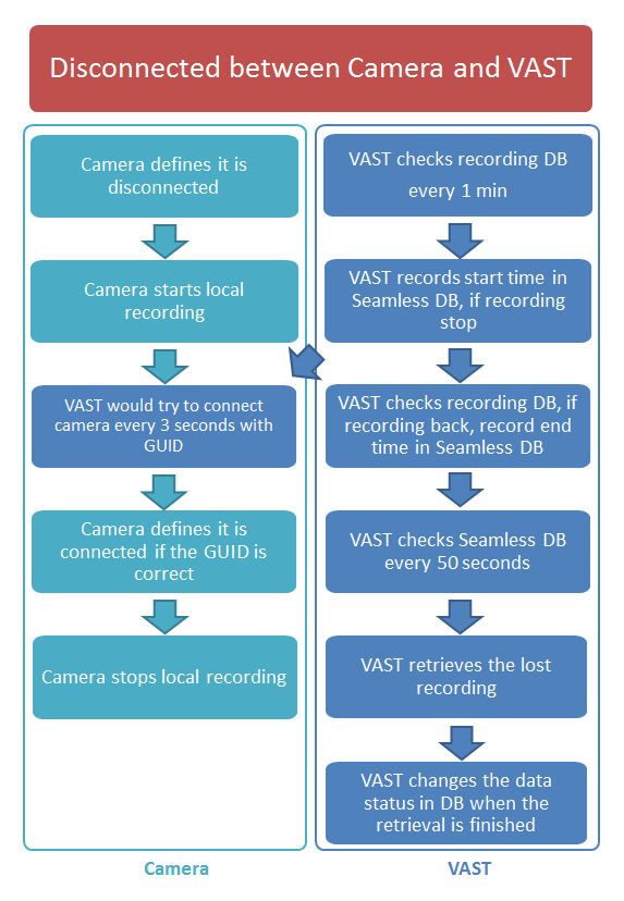 To reconnect, VAST tries every 3 seconds using a unique code (GUID). If the GUID is correct, the camera assumes it’s reconnected. In short, the camera and VAST constantly check in with each other. If they lose contact, they realize quickly and try to reconnect.