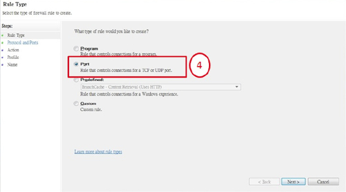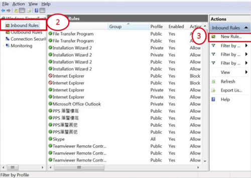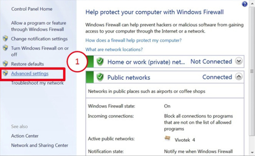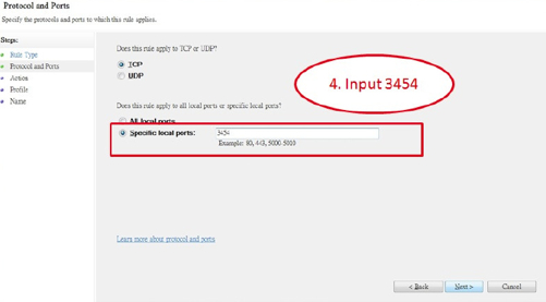 The following figures show an example using Microsoft Firewall of how to ensure port 3454 is available for connections.