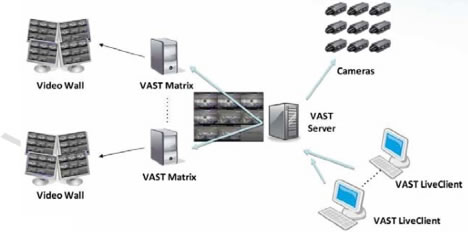 LiveClient and VAST server work with Virtual Matrix to display an unlimited limited number of channels on an unlimited number of screens.