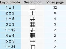 - Flexible arrangement of selected camera feeds – Click the Layout button on the quick access bar. Select the desired layout mode and the arrangement of the channels will change accordingly. Eight layout modes and the corresponding number of video pages are listed below.