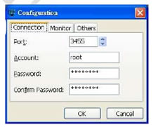 - In the Connection page of the Configuration window, you can change the port used by Matrix (the default is 3455), account (the default is root), and password.