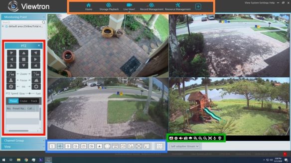 The above screenshot shows a live security camera view of the Viewtron video surveillance software for Windows PCs. The various menus are noted in the orange, red, blue, and green rectangles.