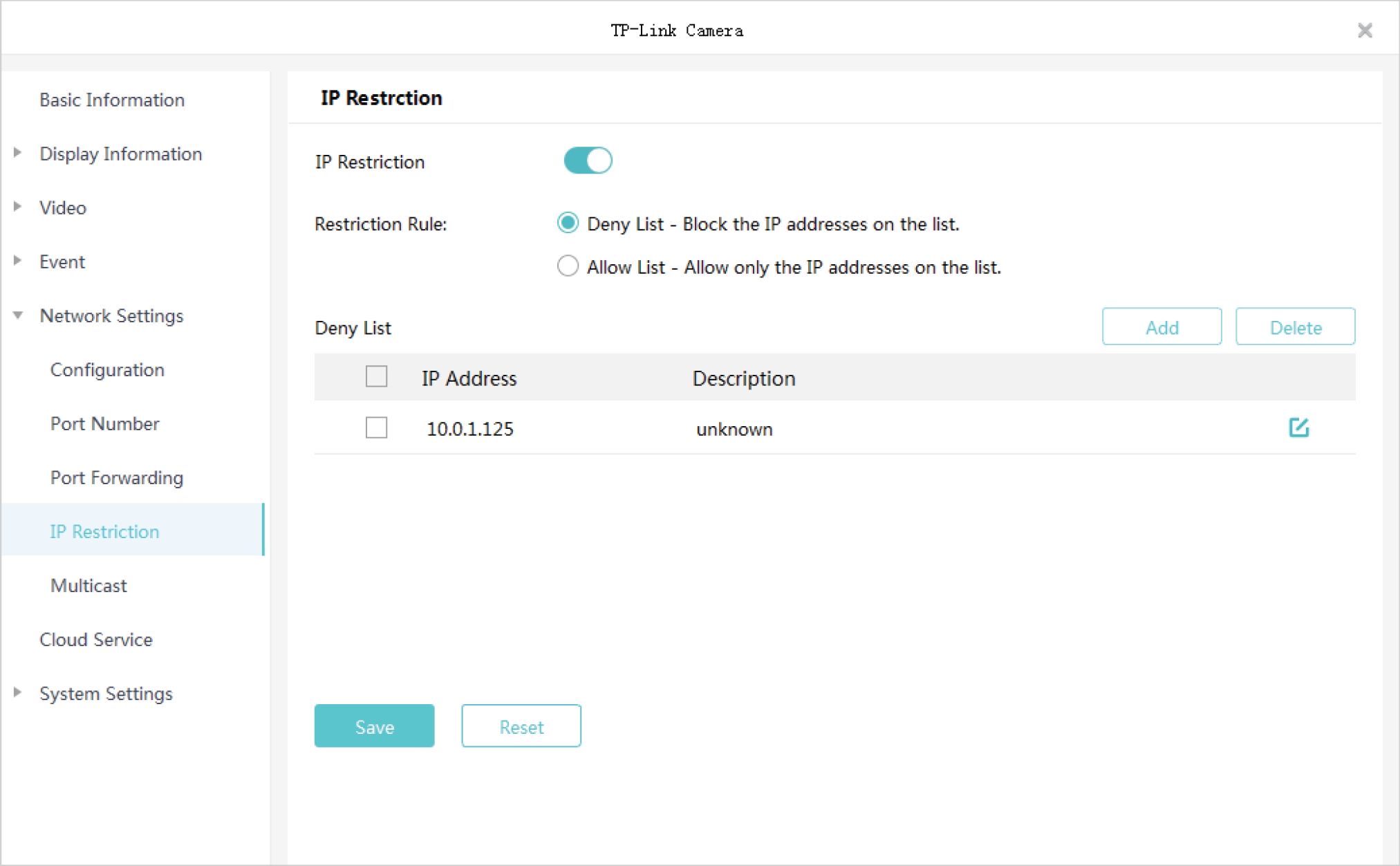 When IP Restriction is enabled, you can add IP addresses to the deny list or allow list to restrict the access to the camera. The IP address in the deny list cannot access the camera, while only the IP addresses in the allow list can access the camera.