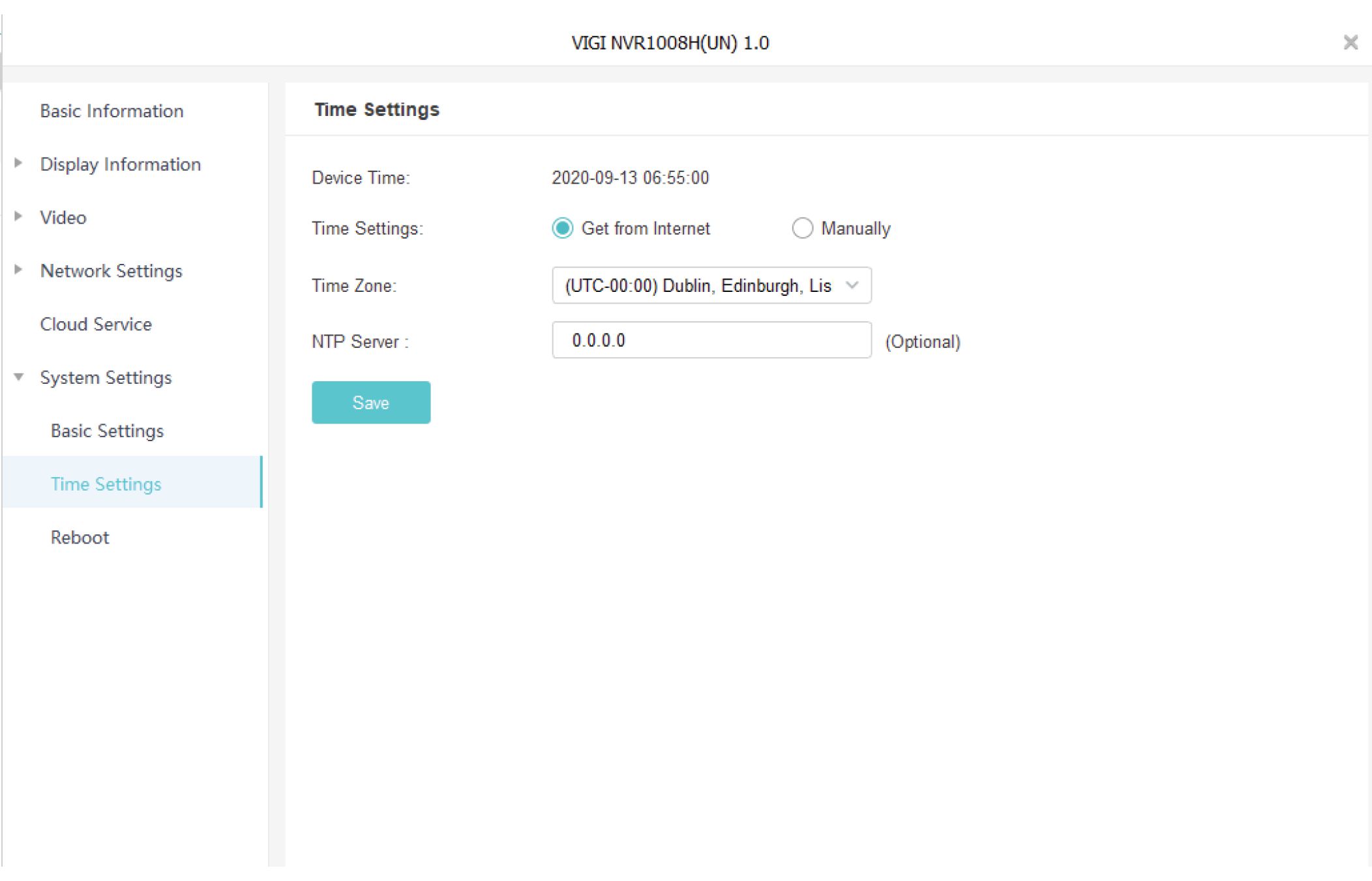 VIGI devices can use NTP (Network Time Protocol) to automatically get the system time from the Internet. You can also customize the NTP Server Address if you don’t want to get the time from the default NTP server address provided by NVR. Then select the time zone according to your region.
