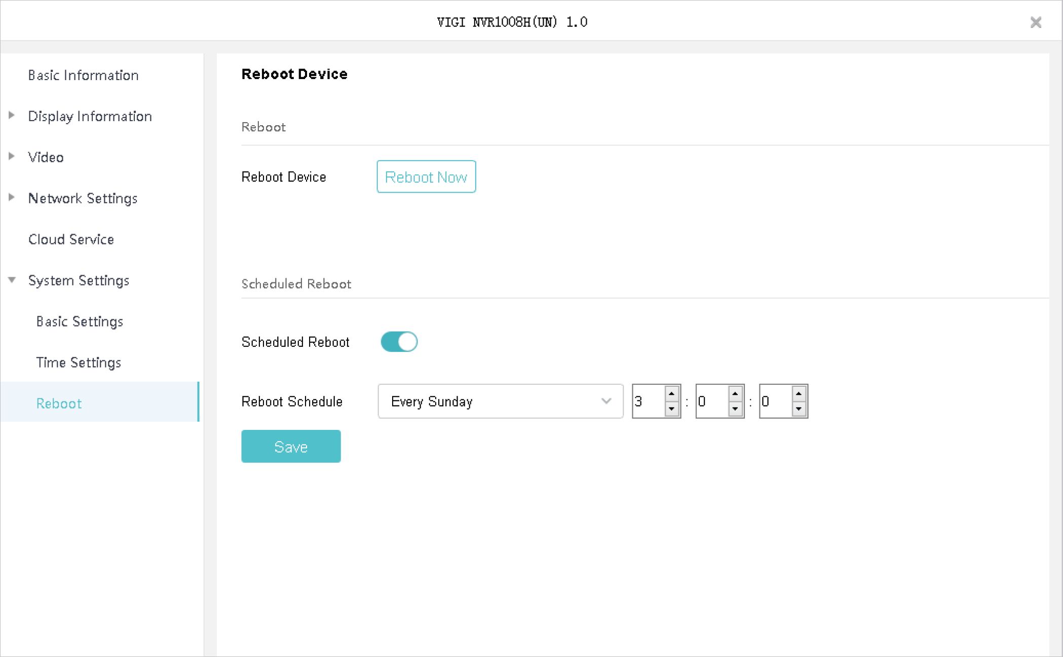 To reboot your devices instantly or set the reboot schedule, go to Settings > Device List and click O in the list. Go to System Settings > Reboot.