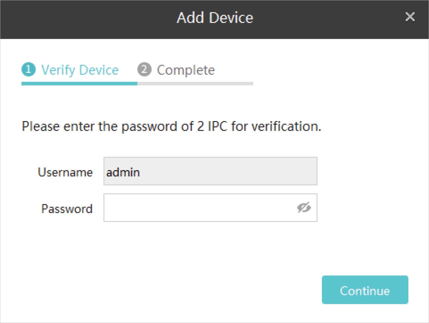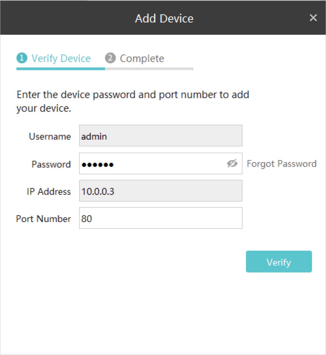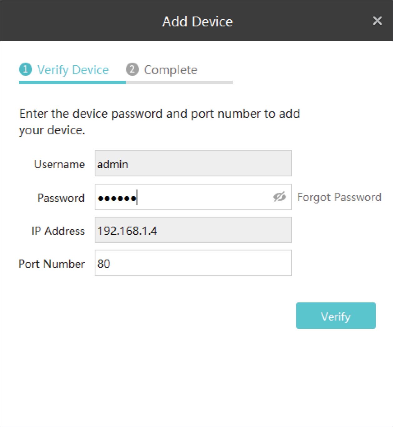 - Enter the password of your device. VIGI Security Manager can automatically detect the IP address and port number of the device, and you can keep them as default. Click Verify.