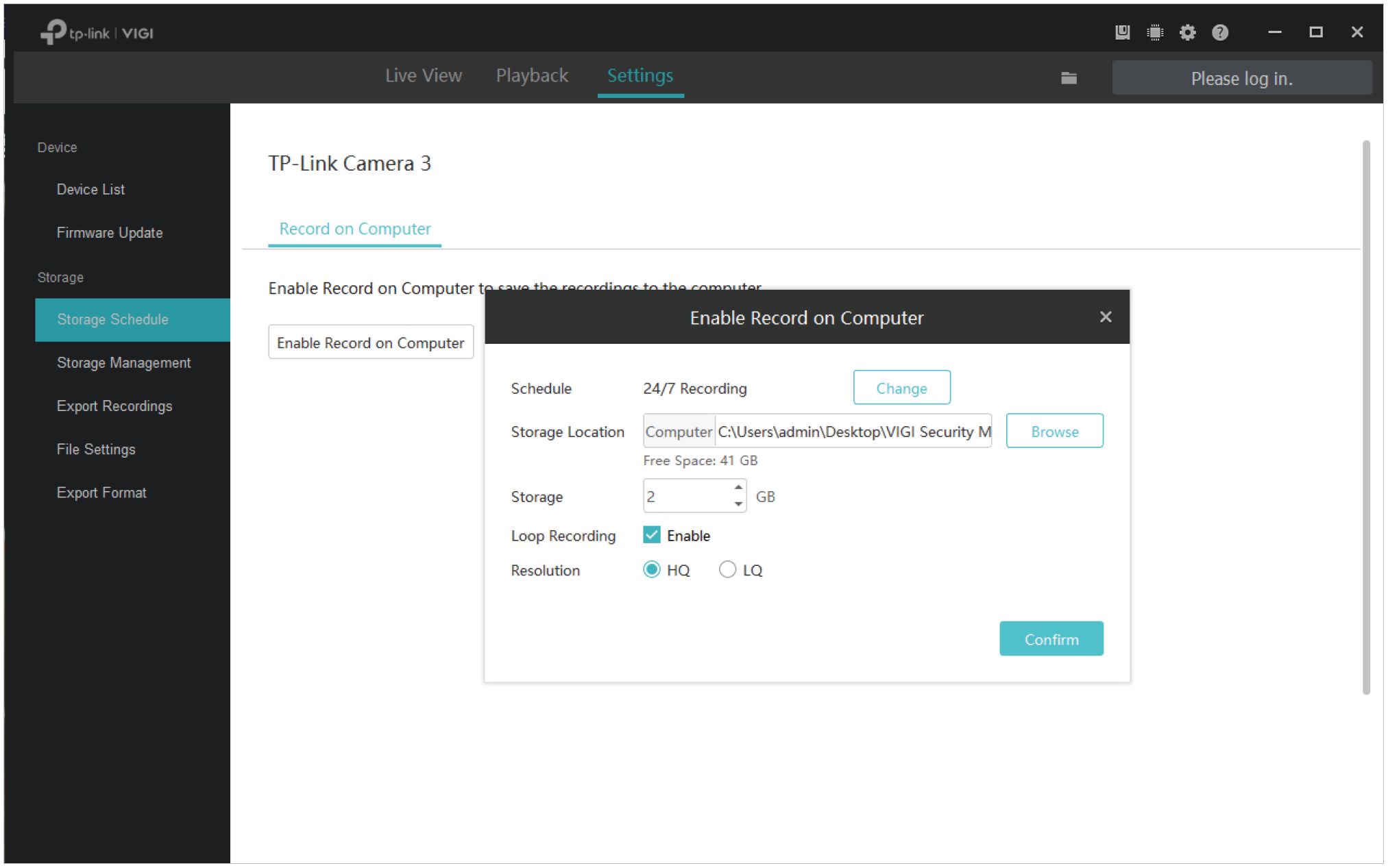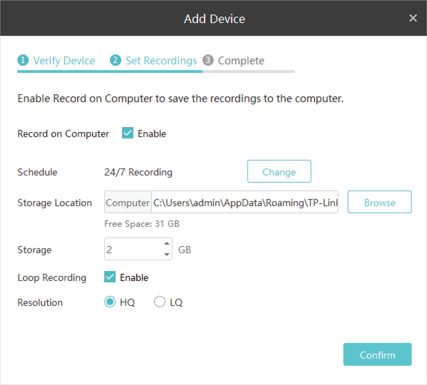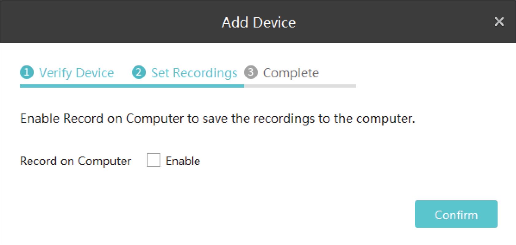 - (Only for cameras) If you don’t want to save the recordings of your camera to your computer, directly click Confirm.