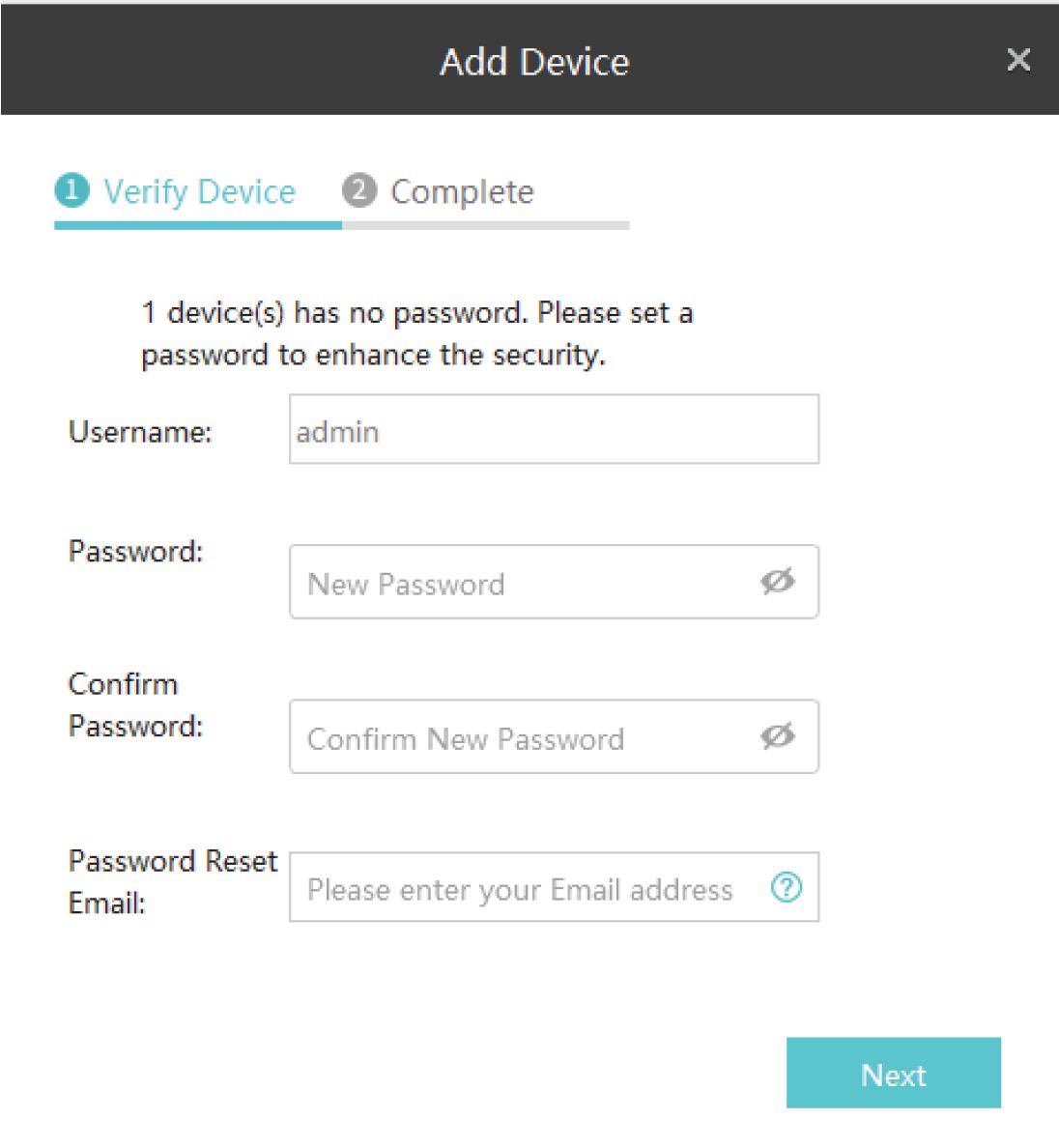 For the camera with no password, you need to set a password and a password reset email to enhance the security before adding it.
