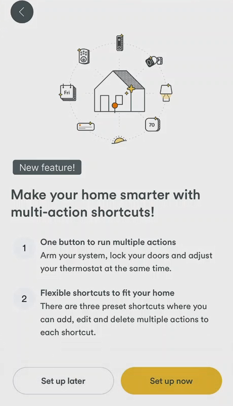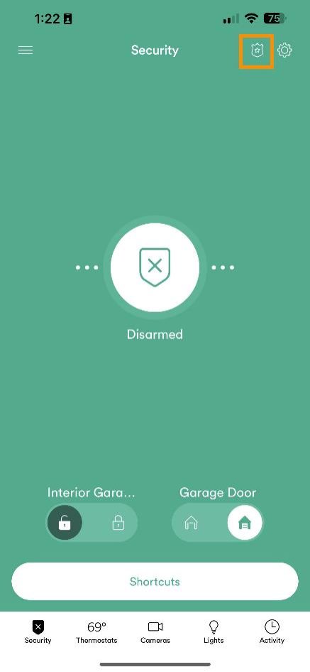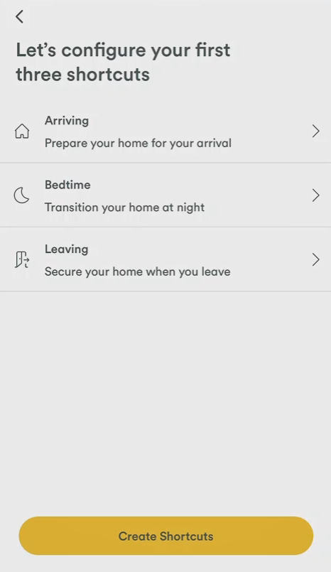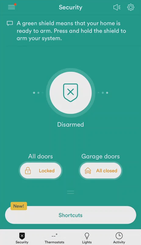 Shortcuts has the capability to execute multiple actions with a single button press. Equipment which can currently be controlled by a shortcut are door locks, garage doors, lamp modules, thermostats, and the panel. If you have these equipment items you will automatically see Shortcuts appear on your app.