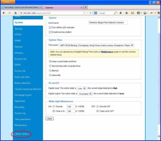 You should see a view of the camera and at the very bottom on the left should be a “Configuration” link. Click that to go into the camera configuration. Also at the bottom with be another link called “Advanced mode”. Select that and new menus will appear.