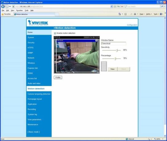 Now we can go back to the Vivotek interface and setup up motion detection (again remember IE is your best bet). Going to the Motion Detection tab you need select “Enable motion detection” and click the New button. This will create a new motion window area to detect motion. Enter a name for the window. Motion will be detected within the area that you select, and will be ignored