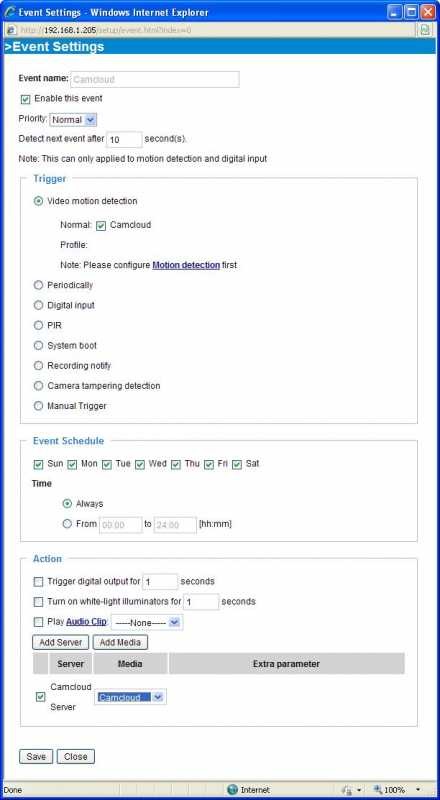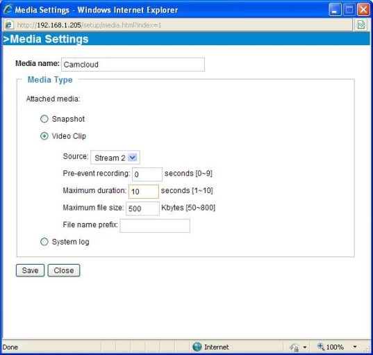 Next we need to add media with the “Add Media” button (which was next to “Add Server” button). Here I changed it to Video Clip, changed to Stream 2 and changed Maximum duration to 10. I would also add pre-event recording to 1 or 2 seconds and change the Max file size to 800 to give you the longest possible video. Save and Close.