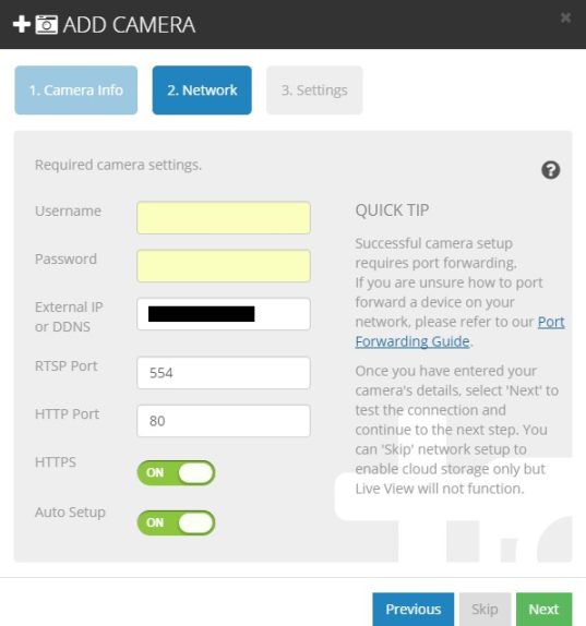Once you click on next, you’ll have to add in your camera’s username, password, IP address, RTSP port, and HTTP port. This means your RTSP & HTTP ports need to be forwarded on your