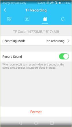Open the APP on your smart phone, go to the home page and find the camera, click the three dots on the right corner of the camera, go to ‘Settings-TF Recording’, to enable the ‘Record Sound’.