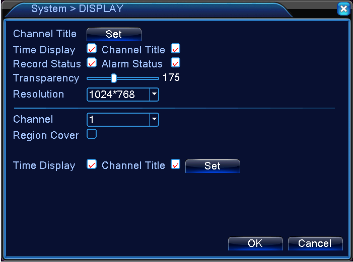 【Time Display】【Channel Title】You can choose the channel from the drop-down menu, then check the boxes for Time Display and Channel Title, click Set button to enter next screen, from there you can adjust the positions for both the Time Display and the