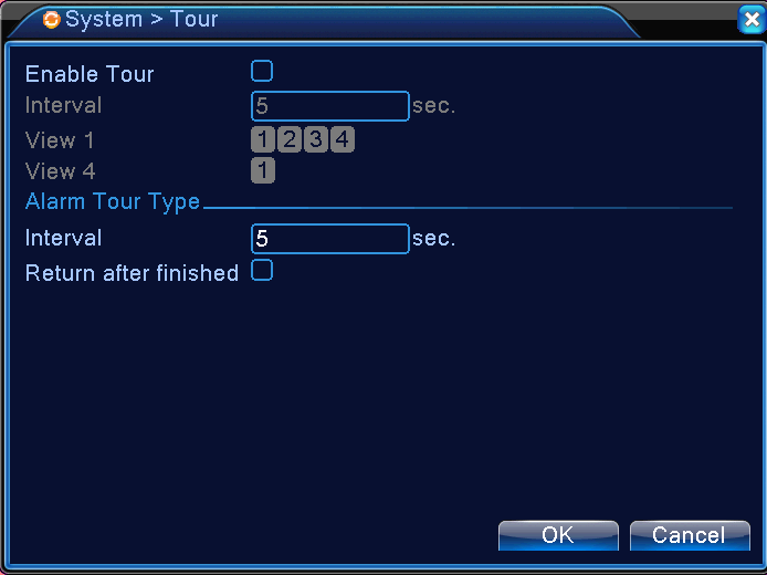 Set up the time interval for the Alarm Tour. Check the box for “Return after finished” to make sure the camera return its original angle after the tour.