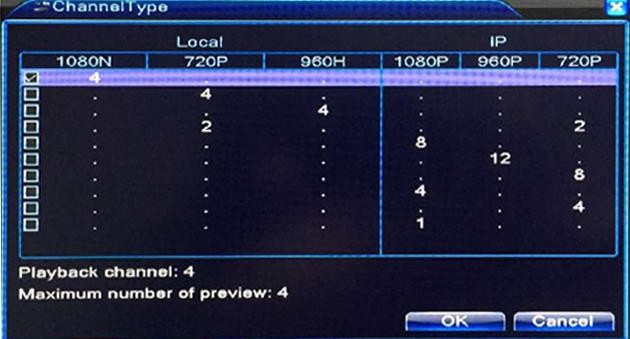 Examples: If you check the box for the first line, it means you can connect up to 4 1080p cameras and 0 IP camera. You can also read the explanation below for more information.