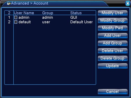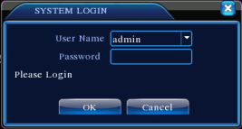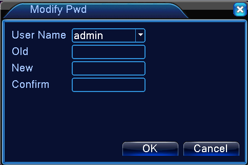 The default user name is “admin”. There is no password, just leave it blank. For operational on changing password, adding or deleting users, please refer to section 4.5.2 Account.