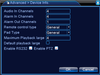 The Device Info shows the basic information of the DVR interface (i.e. Audio In Channels, Alarm In/Out Channels, Max. Playback, etc). You can set some of them per your preference.