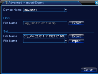 Users can not only export the logs and the configure files from the DVR to a USB memory stick, but also import those configure files from the memory stick to DVR settings. Pay attention to the file format before you Import and Export.