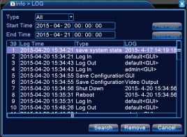 Log information includes: Log in/out, Shut Down, Reboot, Save Configuration, Recording, User Management, and many more related to the operation of the DVR. You can search the logs (based on the Type/Time) and clear them all by click the Remove Button.