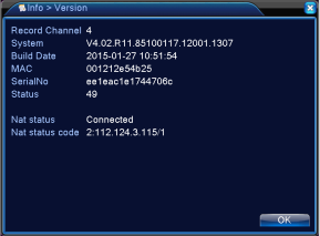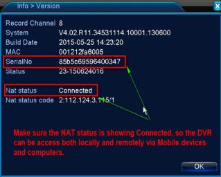 Answer: Make sure your DVR has been connected with the router and the NAT Status is Connected. [Main Menu] – [Info] – [Version] – [NAT Status]