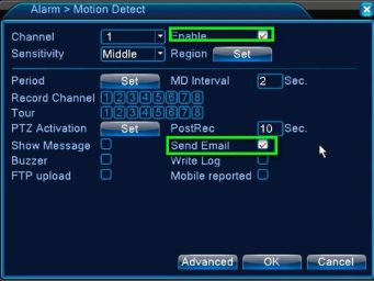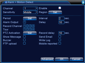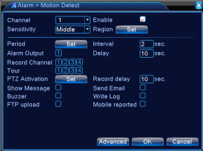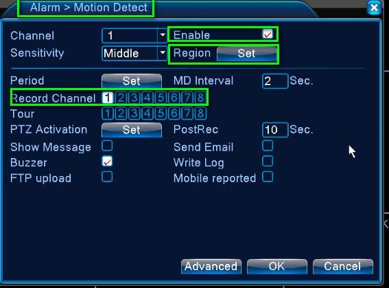 Step 2 Go to Alarm – Motion Detect. Check Enable, Set the motion detection Region if you like, and check the Record Channel (the channel you want it to record upon movement detection). Click Ok to save the settings and exit.