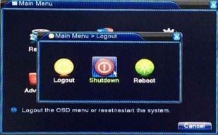 Step1: Enter into Main Menu and select “Logout” – “Shut Down” icon. This will take you to a shutdown window.