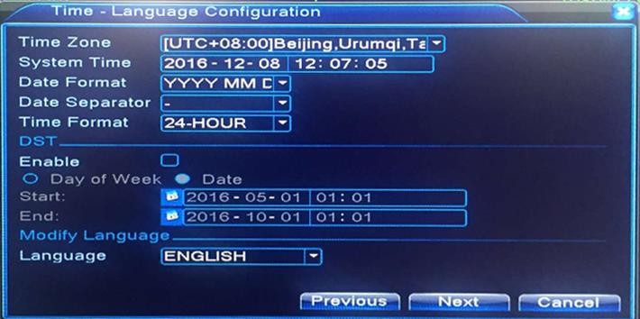 The wizard guide will take you to the settings on the Time/Language/Network Test, just follow the on-screen instruction and click the Next Button. If you do not wish to get the pop-up dialogue box each time you turn on your DVR, you can also turn it off.