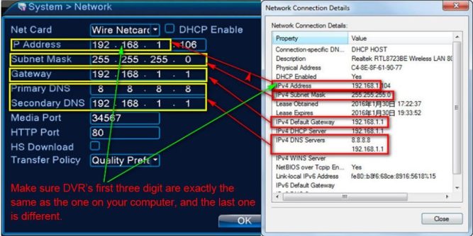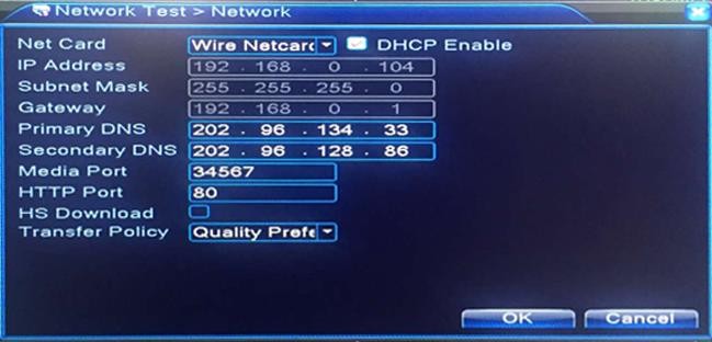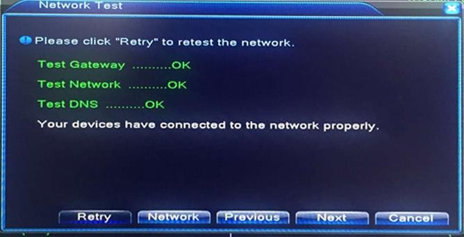 Network test: Make sure your DVR is connected with your router using a network cable. You should be able to see them showing as [OK] before you are able to remotely access the DVR. If you do not see the OK status for Gateway, Network, DNS, Click “Network”. And enable DHCP. And try again.
