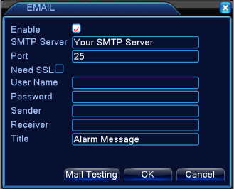 Check the box for Enable. And check Send Email. Refer to 4.4.4 NetService – EMAIL for more information on setup.