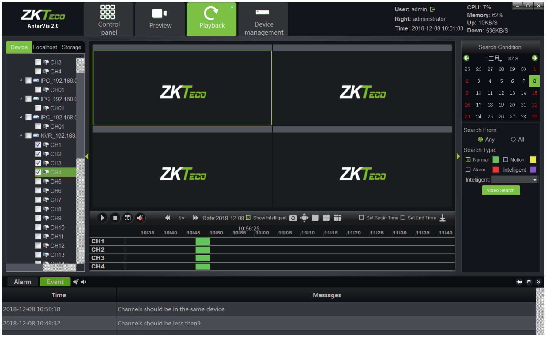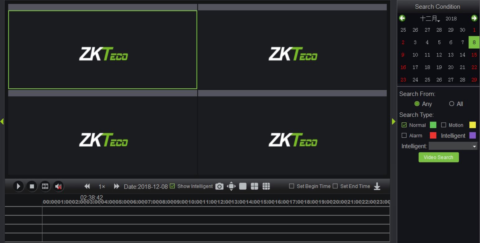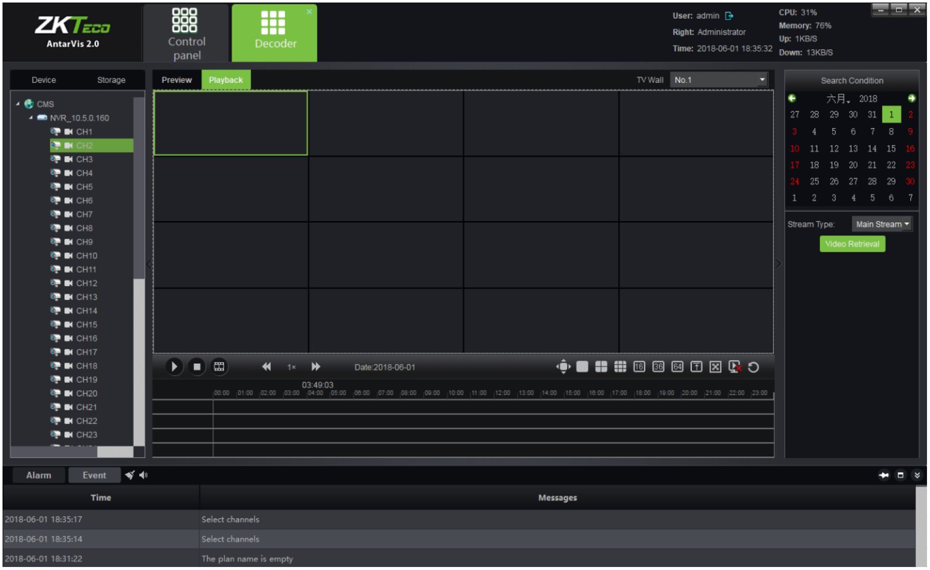 Select a device channel where the video to be played from the device tree on the left. Please note that only videos in the same device or same storage server can be played simultaneously, and at most 9 channels can be selected each time. Select the storage path of the video on the left, select the stream type of the video to be played in the column of “stream type”, and select the date on the calendar, click on “video search”, then the system will starts to search for the relevant video(s) and display the search results on the search result panel.