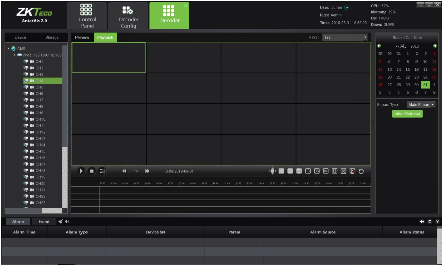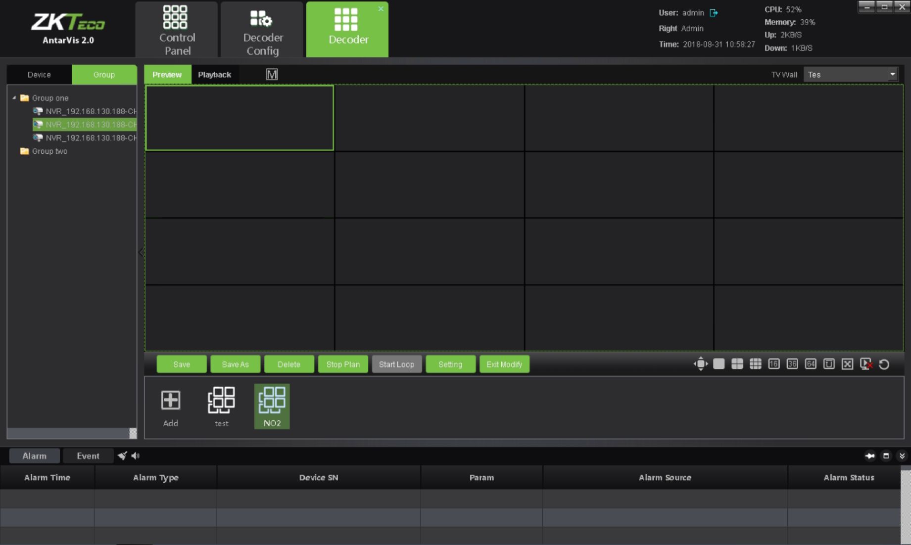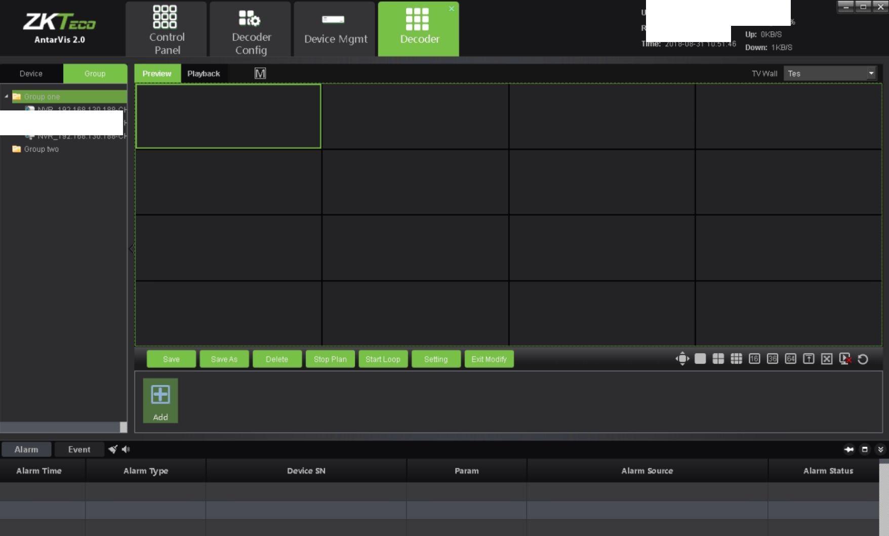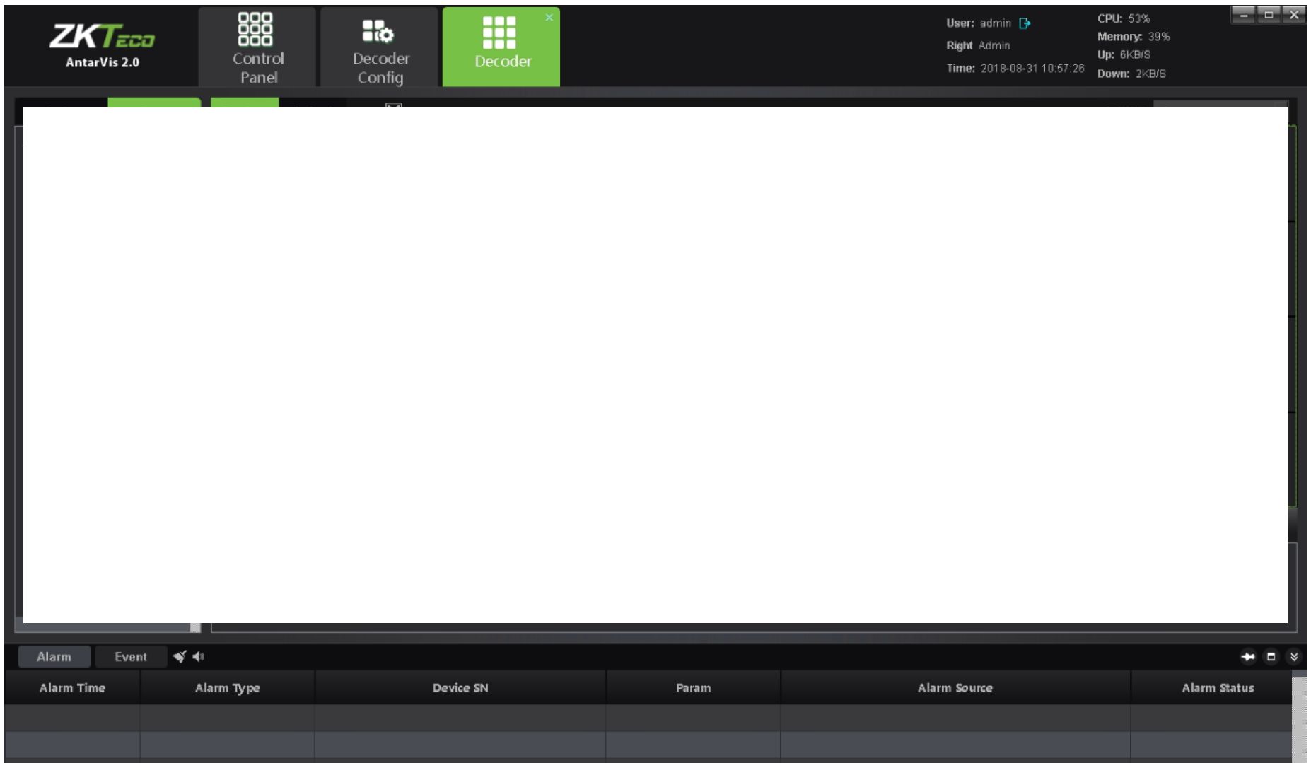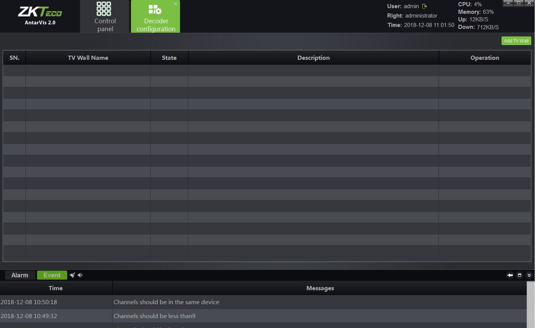 Alarm Event < 4» -*• B Time Messages 2018-12-07 15:39:15 The device added failed 2018-12-07 15:09:58 IP, port, device name and user name could not be empty Switch to decoder interface. This interface, which is similar to that to add a device, displays all