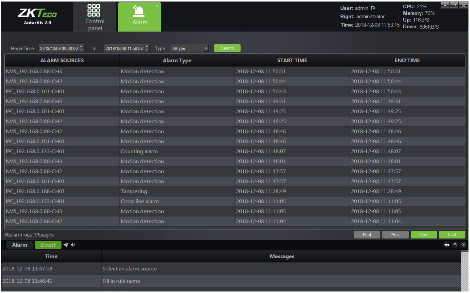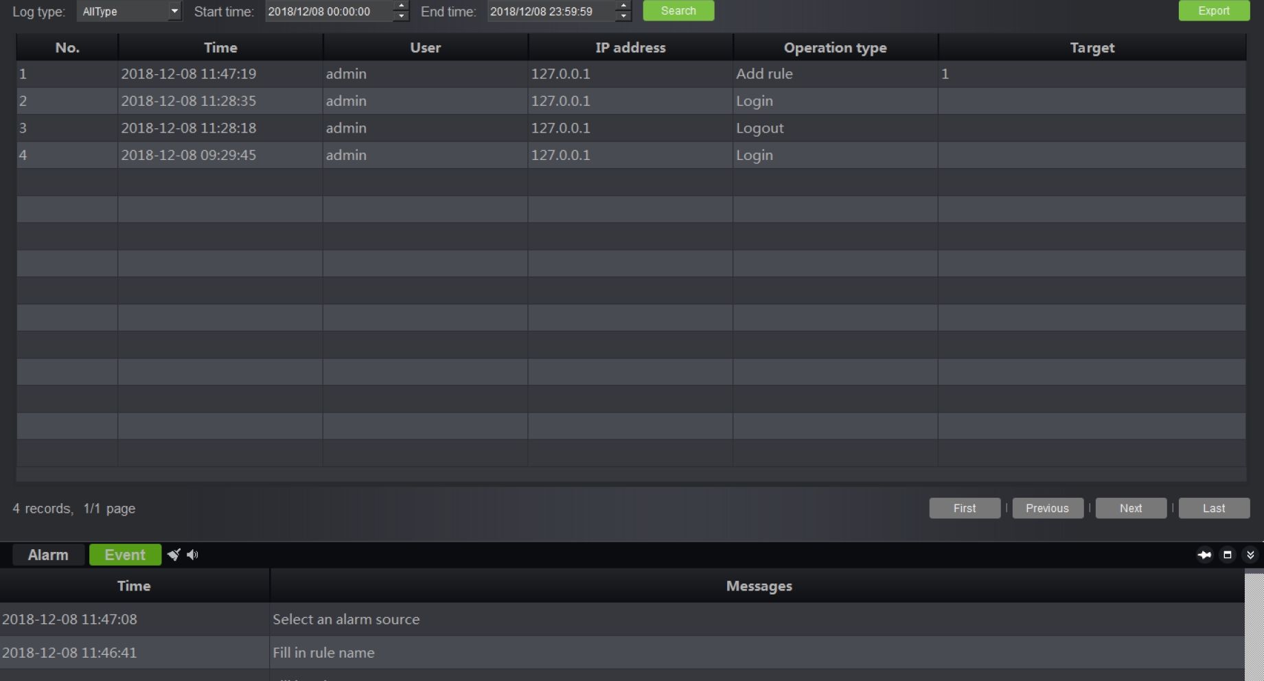 | 2018-12-07 16:14… | Motion detection | 0B3F00020BDF00004624 | 4 | NVR_192.168.0.218-CH4 | Stop Alarm H | |