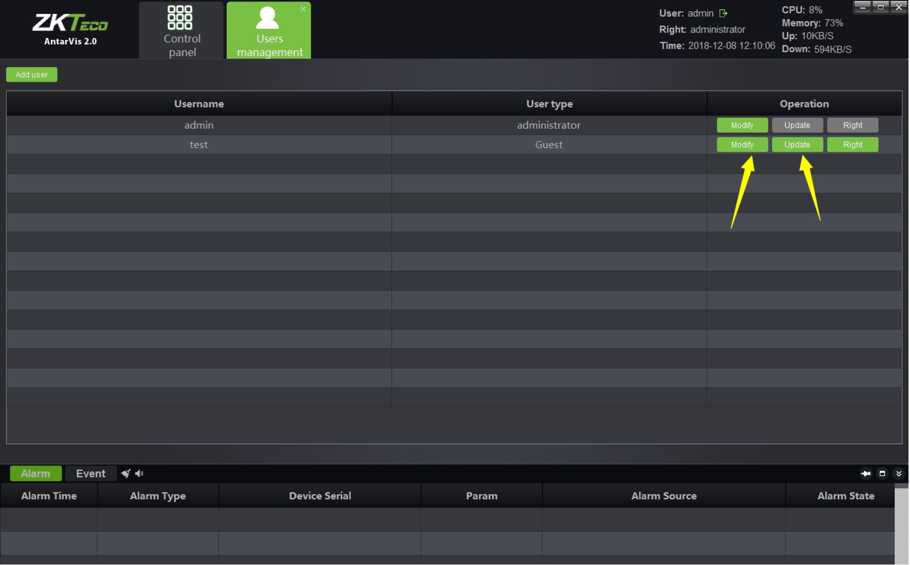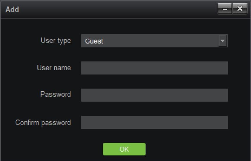 User admin listed in the user management interface has the rights to set privilege for sub-users and users. There is a default super user whose name is “admin”, which can not be deleted and has all privileges. Click on “Modify” to change the password of the super user.