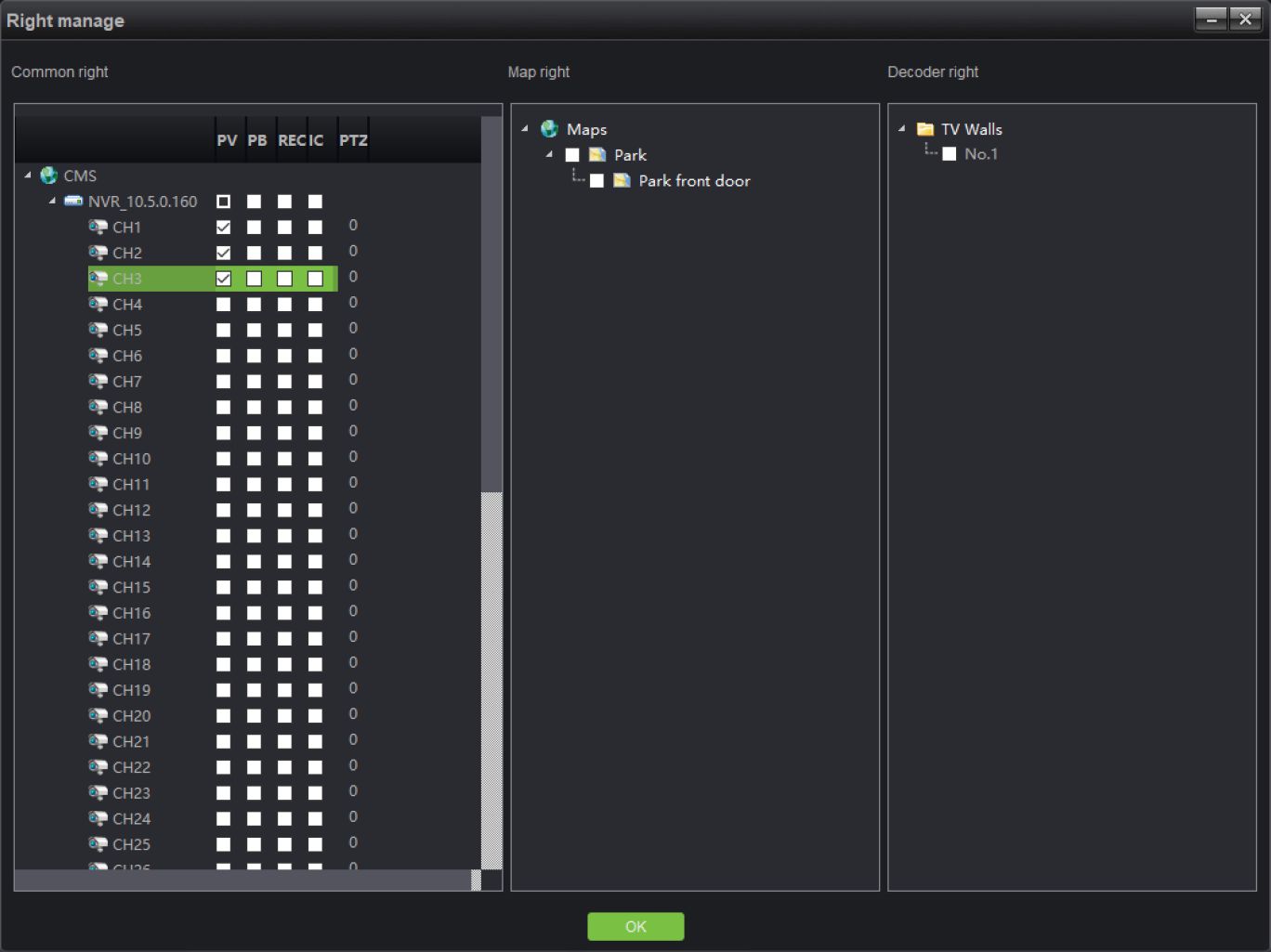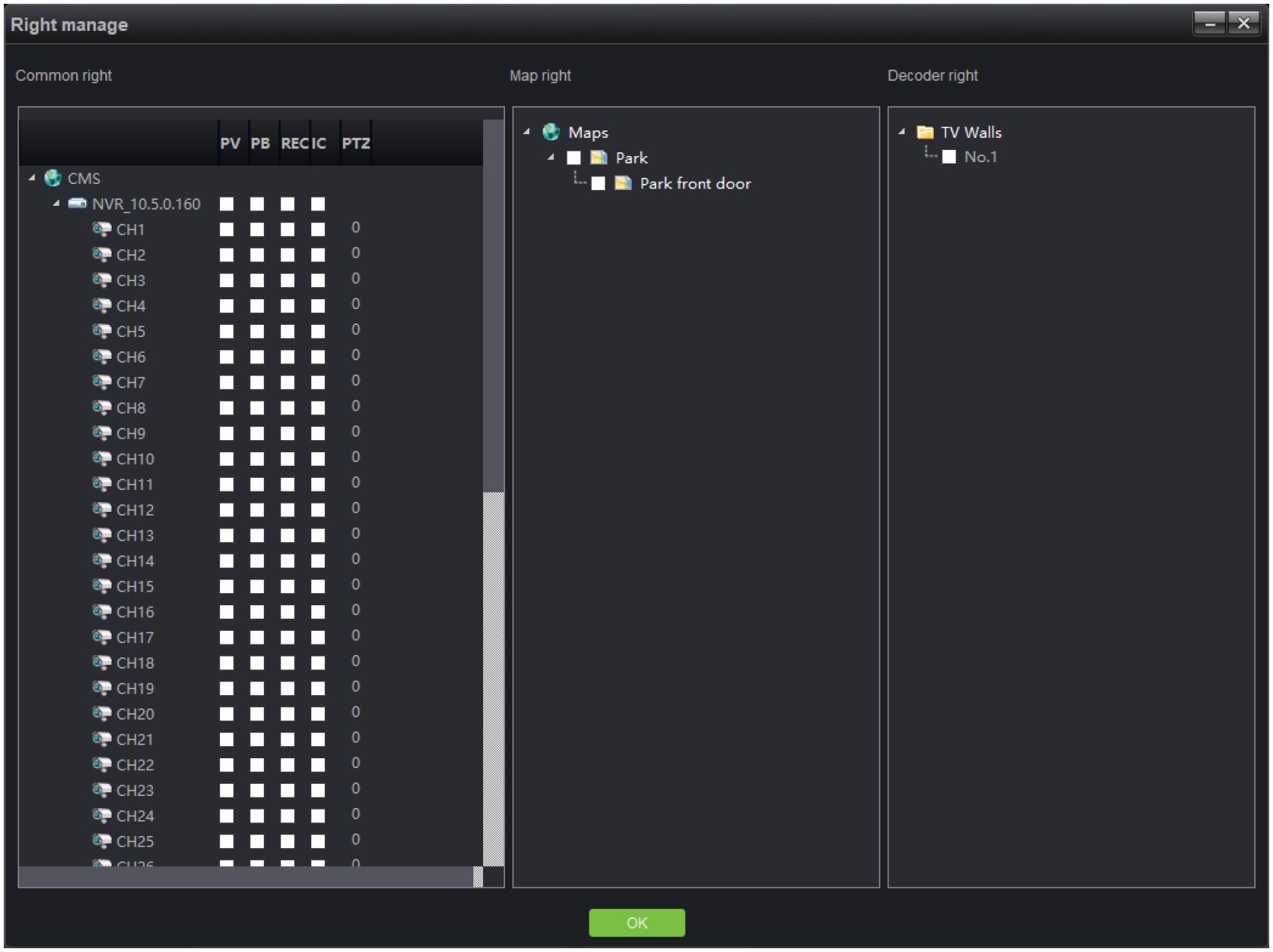 To assign sub-users access rights, click on the “Right” button indicated in the figure to grant the users relevant access privileges: