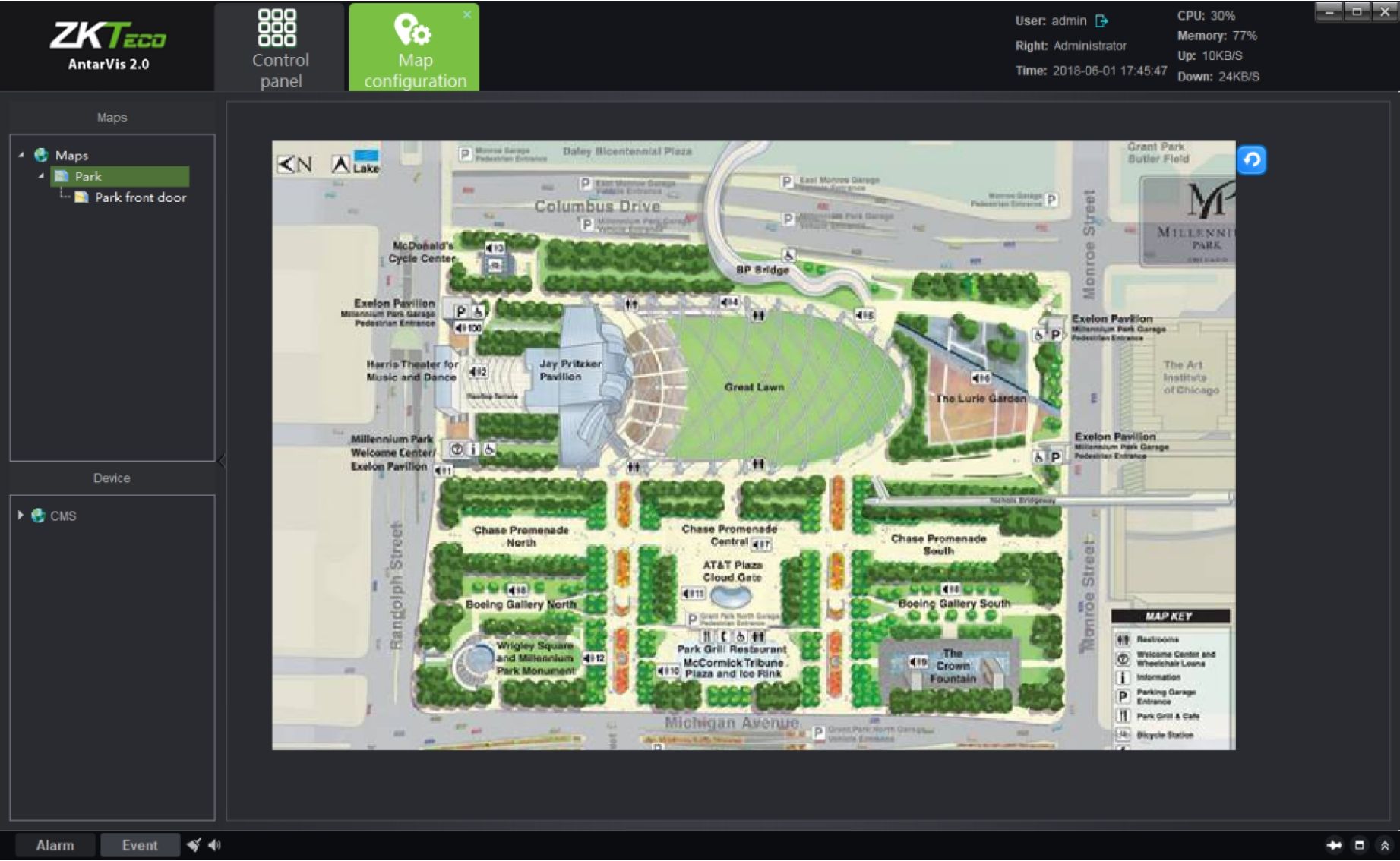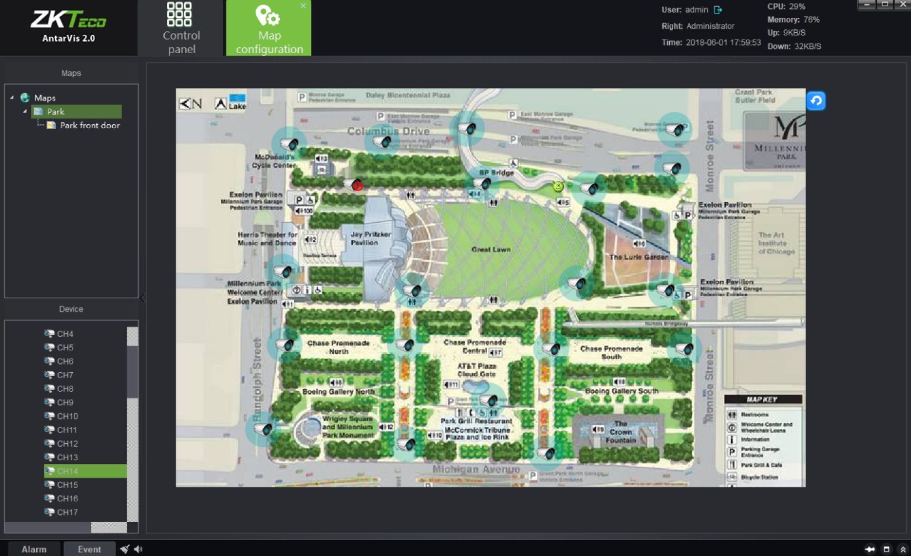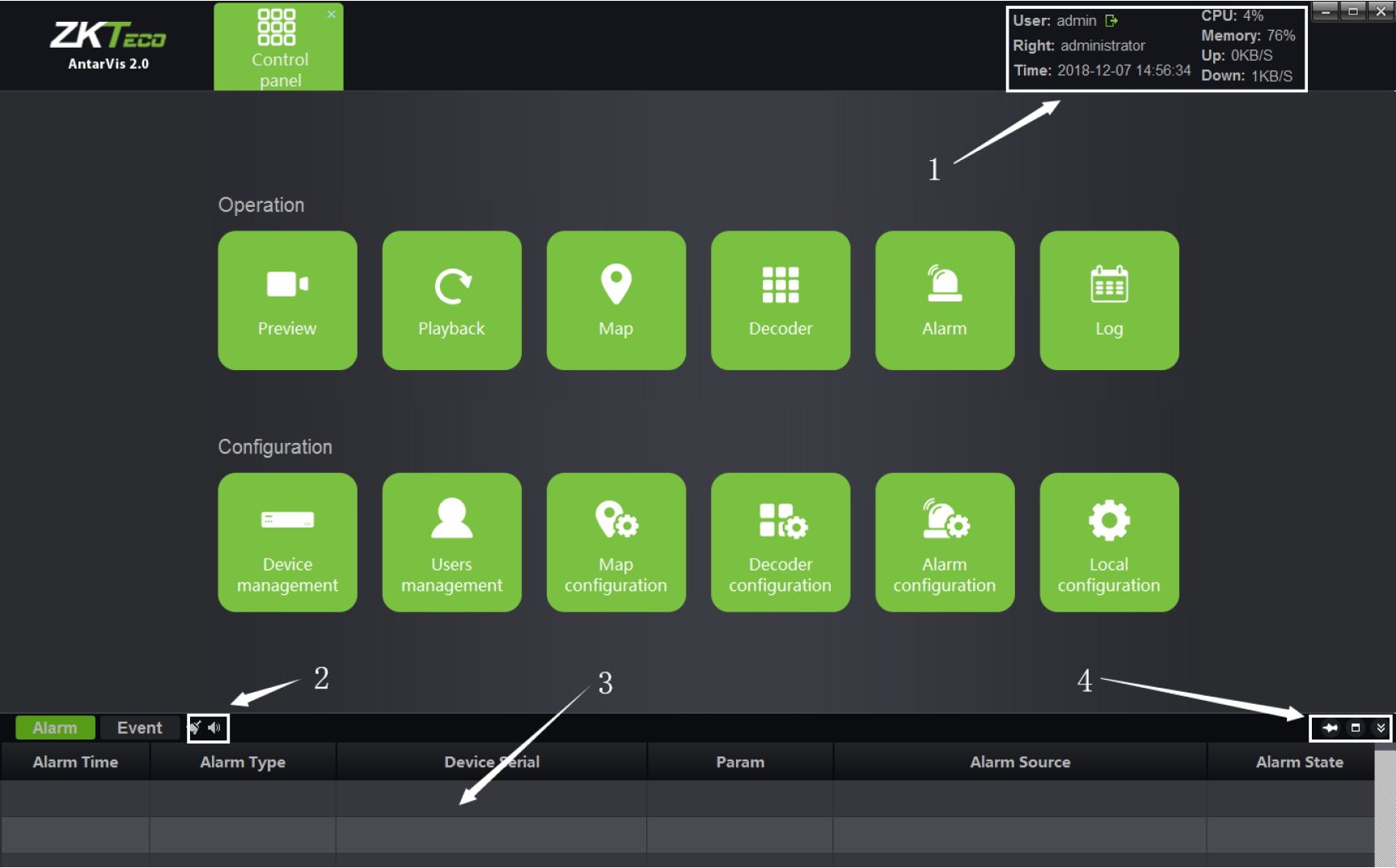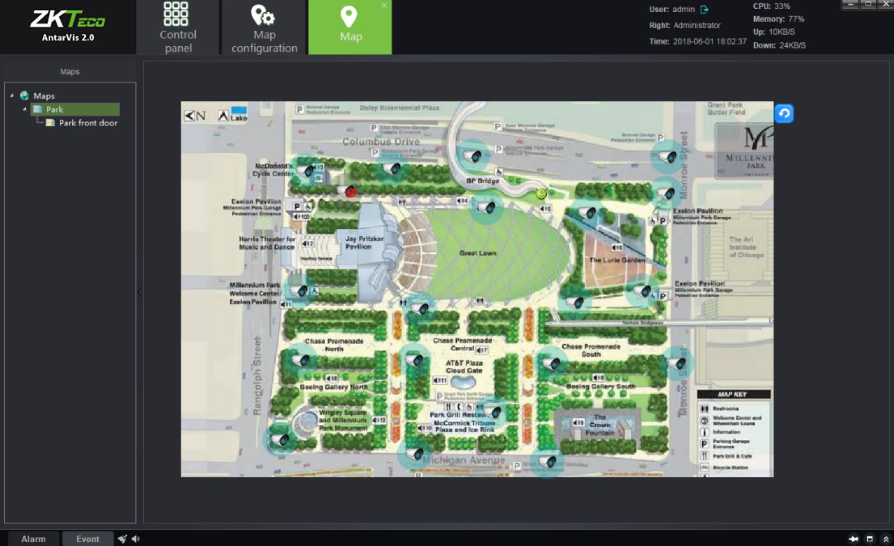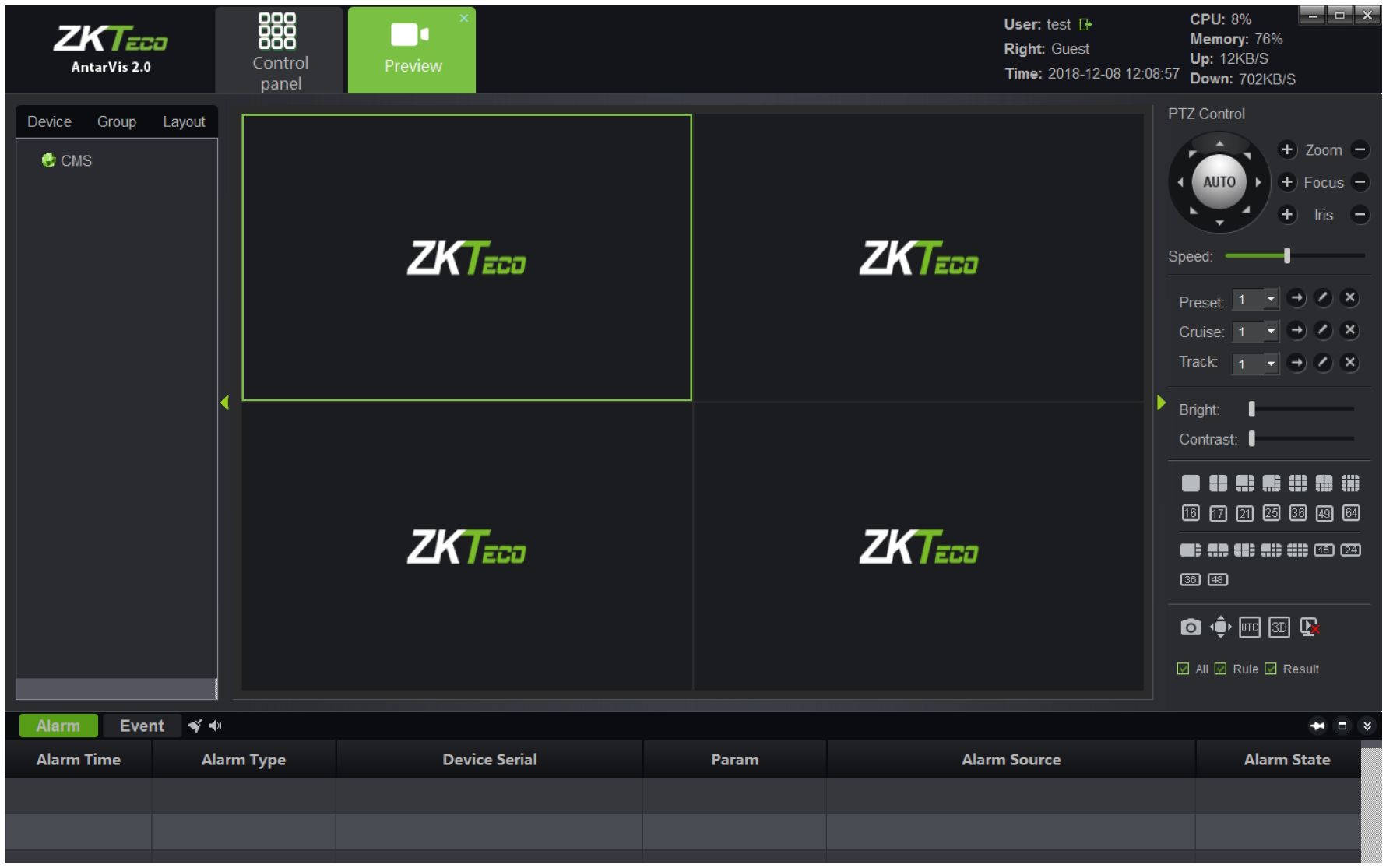 ZKTeco Antarvis VMS User Guide, AntarVis2.0 is the professional software for the central management of the front end network monitoring devices, including NVR, DVR, IPC, MDI, SDI and etc. It is to mainly fulfill the functions as real-time preview, video playback, E-map, alarm linkage, decoding on the wall, support the WEB access and mobile phone client access.
